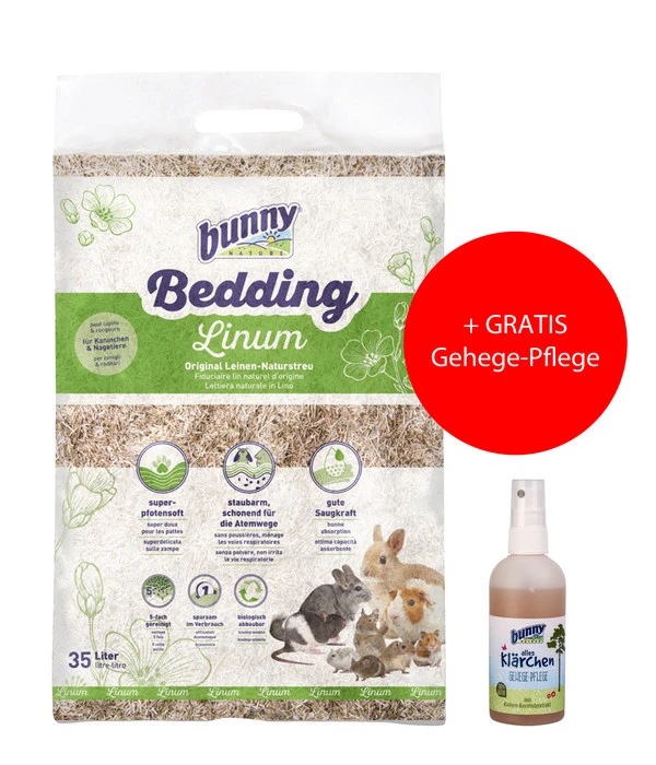 Das Bundle aus komfortabler Einstreu und Gehege-Pflege bietet zahlreiche Vorteile: gemeinsam wirkt es effektiv gegen Bakterien und Schmutz in Ihrem Kleintierheim. Der Untergrund aus Leinen ist super soft zu kleinen Pfoten und zudem saugstark und biologisch abbaubar. Da das Natur-Produkt staubarm ist, schont es außerdem die Atemwege. Des Weiteren bindet die Einstreu Bedding Linum zuverlässig Gerüche und hält bis zu zwei Wochen trocken. Das Kiefernkernholz-Spray Alles Klärchen sorgt für eine Extra-Frische bei der Gehege-Reinigung. Bestellen Sie sich jetzt dieses attraktive Bundle aus Naturstreu und gratis Gehege-Pflege von bunny® NATURE – auch Ihr Kleintier wird es Ihnen danken!