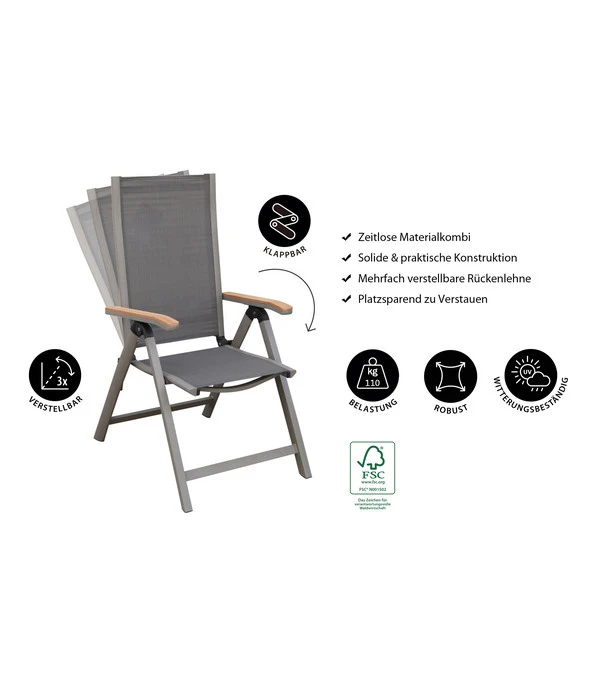 Der erste sonnig-warme Frühlingstag ist immer ein ganz besonderes Ereignis im Jahresverlauf, denn dann wird der Klappstuhl ‚Colmar‘ aus seinem Winterschlaf geholt und darf Sie mit seinem Komfort verwöhnen. Am liebsten von morgens früh bis abends spät, an jedem schönen Sommertag! Es könnte tatsächlich sein, dass Sie, sobald Sie den Klappstuhl ‚Colmar‘ bei sich zu Hause haben, weniger das Bedürfnis haben, abends noch einmal aus zu gehen, sondern es genießen, den Feierabend gemütlich auf der Terrasse zu verbringen. Wo jeder – Familie, Freunde, Nachbarn – einen herrlich bequemen Klappstuhl ‚Colmar‘ zur Verfügung hat! Doch man sitzt nicht nur einfach gut in diesem Gartenstuhl, sondern sein Design ist elegant und funktional zugleich. Die Materialkombi aus Metall, Kunststoffgewebe und Teakholz liegt im Moment voll im Trend, ist aber zugleich so zeitlos, dass Ihnen der Klappstuhl ‚Colmar‘ auch in vielen Jahren noch so gut gefallen wird wie am ersten Tag.