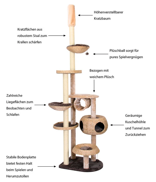 Kratzbaum, deckenhoch und höhenverstellbar, mit plüschigen Liegeflächen, Höhle und Spielkugel, aus Sisal und Wasserhyazinthe