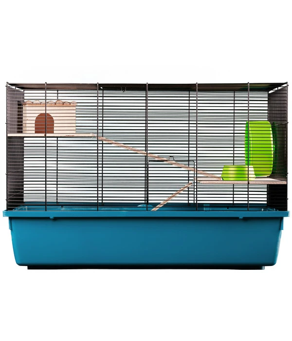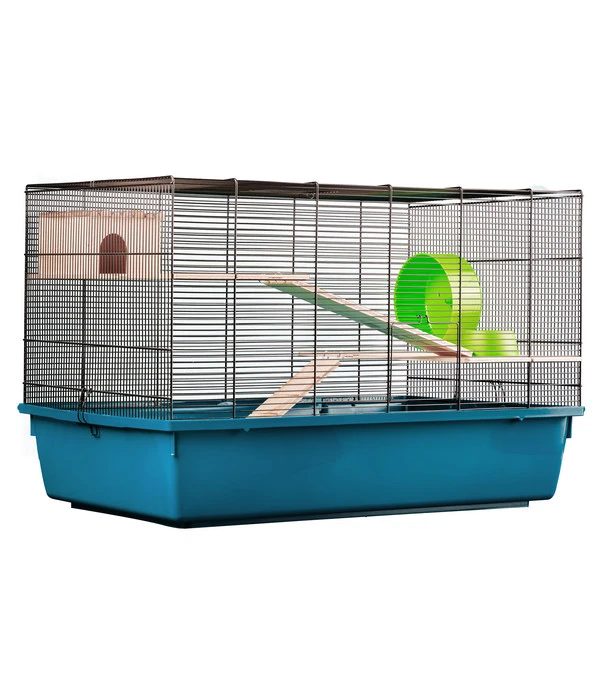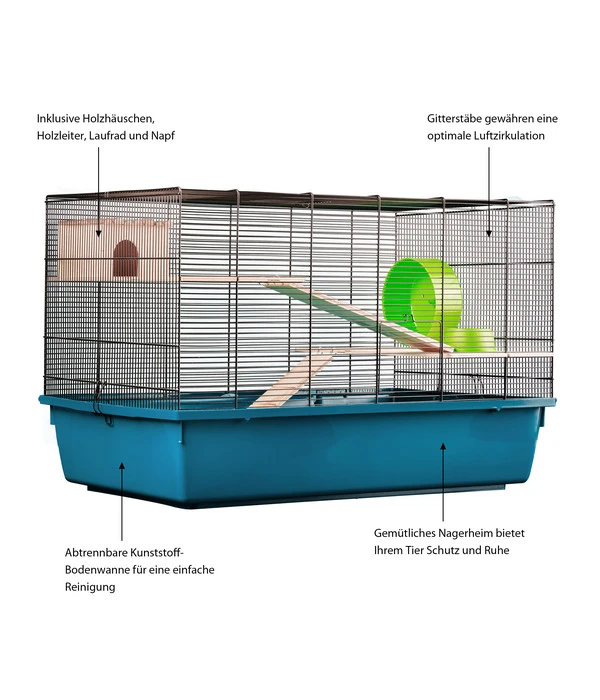 Sie wollen Ihrem Nager einen angenehmen Rückzugsort in Ihrem Indoor-Freigehege zukommen lassen? Dann ist das Nagerheim Paleromo von Dehner Lieblinge genau das Richtige für Sie. Hier kann Ihr Tier nach Lust und Laune buddeln, fressen und schlafen und das an einem Platz, der ihm zugleich Schutz und Ruhe bietet. Ausgestattet ist der praktische Käfig mit umfangreichem Zubehör. Gestalten Sie dieses gemütliche sowie mehretagige Heim für Ihren Kleinnager mit dem mitgelieferten Häuschen, dem Laufrad und dem Napf, damit er das Nagerheim Paleromo von Dehner vielseitig nutzen kann.