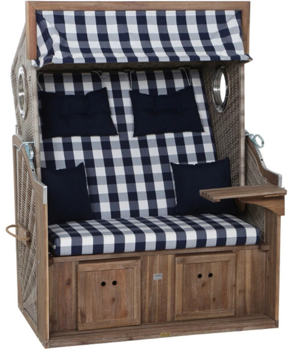 Der Strandkorb Greenline 35 hat ein stabiles Gestell aus FSC®-zertifiziertem Akazienholz, das dekorative Geflecht an den Seiten besteht aus wetterfestem Kunststoff. Auch für die Polster, die Kopfstützen und die Kuschelkissen wurde eine hochwertige, sehr strapazierfähige Materialqualität – Polyester – gewählt. Die Kissen können Sie sogar herausnehmen und per Hand waschen. Ein besonderes Extra sind die beiden metallgefassten Bullaugen, die Ihnen den Blick in Ihren schönen Garten erlauben.