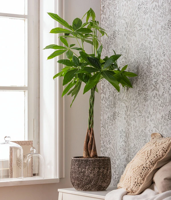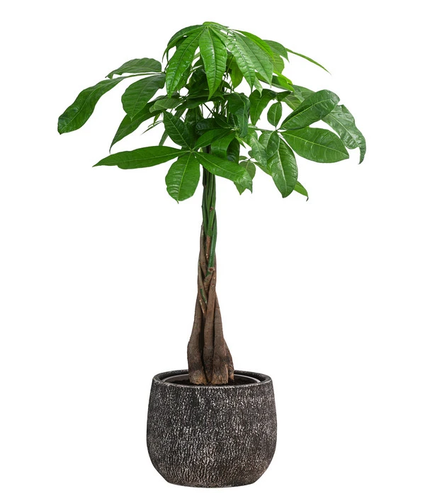 Damit das Glück Ihnen hold bleibt, sollten Sie Ihrer neuen Pachira bestenfalls einen luftfeuchten, hellen oder halbschattigen Standort ohne direkte Sonne schenken. Sie ist die perfekte Solitärpflanze und auch der dekorative Übertopf trägt seinen Teil bei. Wenn der Sommer naht, möchte die Glückskastanie Sie gerne nach draußen begleiten und darf dann sogar geschützt im Freien stehen. Denke Sie daran, gelegentlich die hübschen Blätter von Staub zu befreien, ansonsten ist eine Glückskastanie recht pflegeleicht. Sichern Sie sich gleich Ihr Glück samt Übertopf oder verschenken Sie die Pachira an Freunde, Familie oder Kollegen.