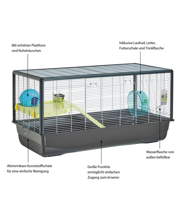 Ein riesengroßer Vorteil vom SAVIC Nagerheim Plaza für Hamster ist auch das ebenso umfassende wie vielseitige farbenfrohe Zubehör, das Ihnen mitgeliefert wird: Eck-Etage, Leiter, Edelstahl-Futterschale, Laufrad, Hamsterhaus und eine 150 ml-Trinkflasche. Damit ist Ihr Hamster in diesem Kleintierkäfig optimal beschäftigt und versorgt! Er kann zwischen den beiden Etagen hin und her flitzen, im Laufrad überschüssige Energien loswerden und sich danach mit leckerem Hamsterfutter stärken.