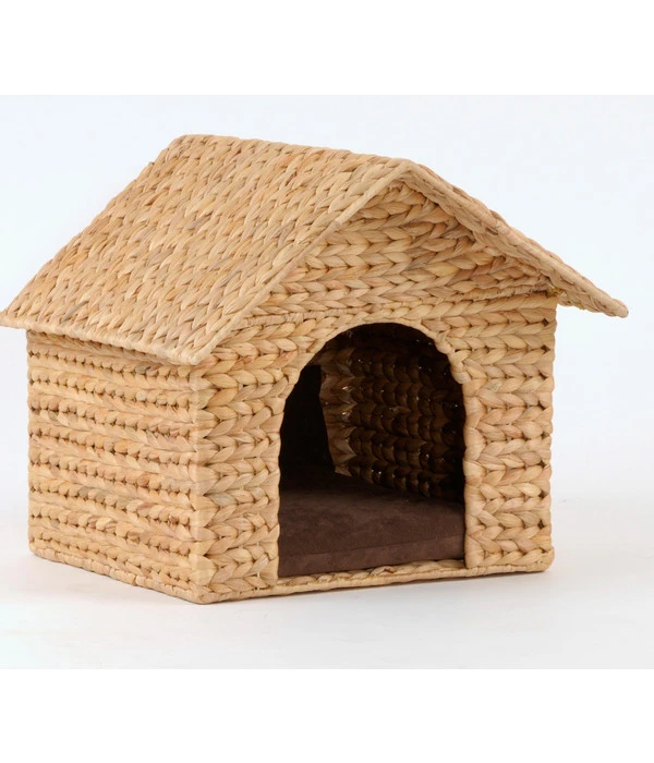 Diese wunderschöne naturfarbene Katzenhütte wird durch das stabile Metallgestell zu einem echten Katzen-Wohnhaus! Solide gefertigt durch das Verflechten von weicher und anschmiegsamer Wasserhyazinthe, ist dieser Metallrahmen die Basis für den festen und sicheren Stand von diesem Katzenhaus.