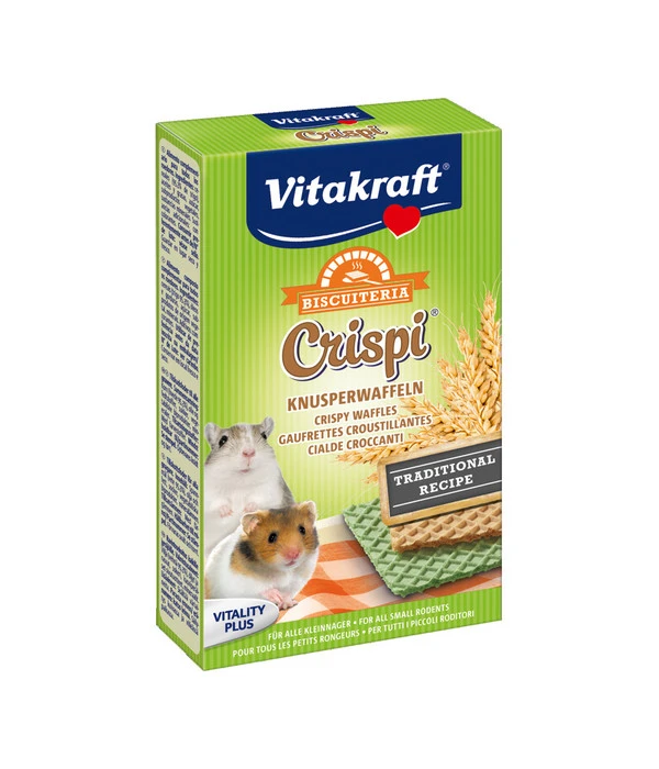 Eine Knusperfreude für Ihren kleinen Mitbewohner: leichte Crispis von Vitakraft als Snack für Ihren Nager. Eine kleine Belohnung, zusätzlich zum eigentlichen Futter. Neben dem Knabbergenuss ist es eine ideale Beschäftigung im Hamsterkäfig. Die gebackenen Waffeln sind frei von Konservierungsstoffen und künstlichen Aromen. Verwöhnen Sie Ihren Liebling mit einer halben oder einer ganzen Waffel pro Tag und geben Sie weiteres Futter wie gewohnt in den Hamsterkäfig.