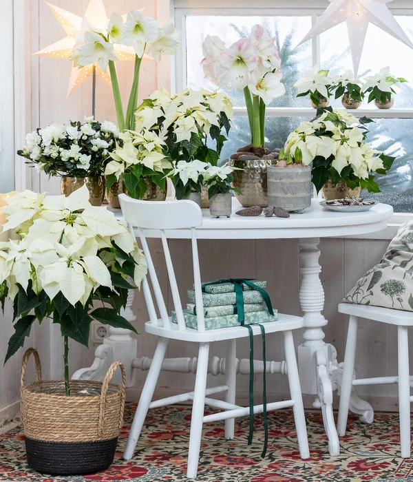 Mit seiner imponierenden Erscheinung und der Größe von 70 – 90 cm ist der Weihnachtsstern ideal, um in Einzelstellung auf dem Boden für eine festliche Wohnatmosphäre zu sorgen. Ist Ihnen dies zu puristisch, hängen Sie ein paar Kugeln, Sterne und ähnliches an die Zweige, wahlweise in Rot oder Weiß, und arrangieren Tannengrün und eine Lichterkette zu seinen Füßen. Ein toller Anblick, der Sie sofort in Weihnachtsstimmung versetzen wird!
